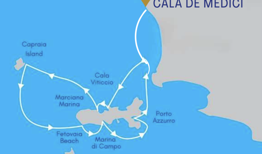 La partenza è prevista da Cala de’ Medici – Castiglioncello, una delle marine più moderne della costa toscana. Da qui, salperai alla scoperta dei luoghi più affascinanti dell’Elba e dell’isola selvaggia di Capraia, tra baie protette, acque turchesi e caratteristici borghi sul mare.